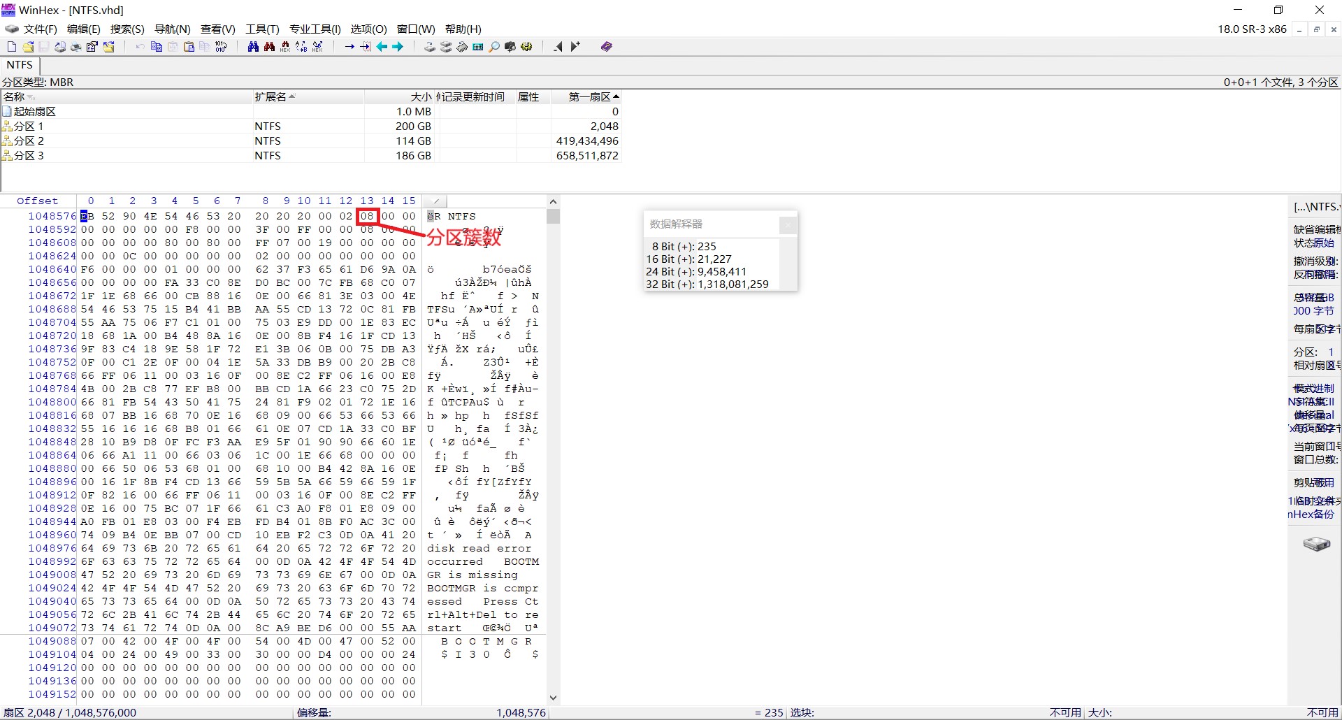 接着,用WinHex打开我们需要提取数据的硬盘,找到我们的NTFS分区的DBR,找到我们的分区簇数,如图: