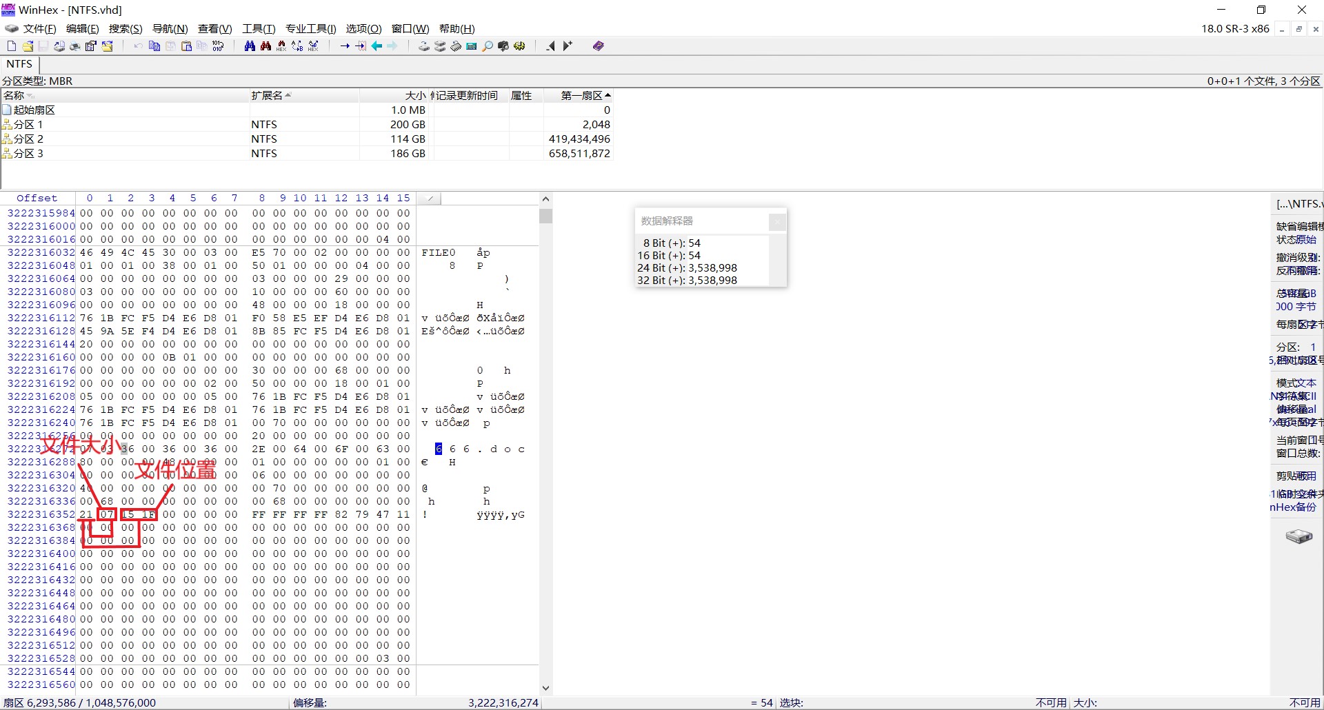 在数据解释器中复制他们的十进制值(一个字节8bit,两个字节16bit,以此类推)然后乘分区簇数得出位置和大小
